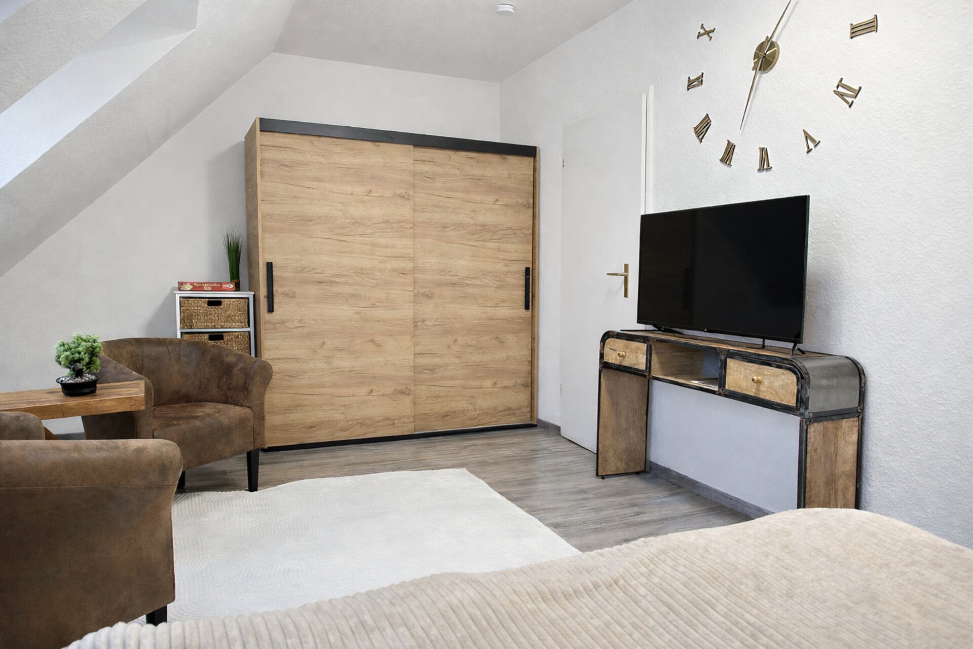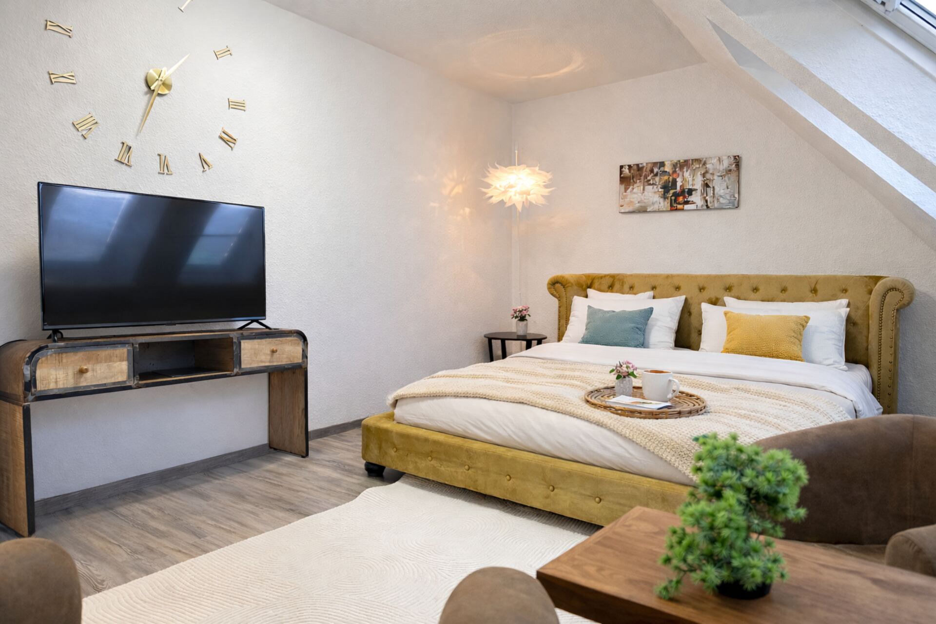 Dieses moderne Dachgeschoss-Studio ist ideal für Paare und Geschäftsreisende, die Wert auf Stil, Ruhe und eine zentrale Lage legen. Der offene Wohn- und Schlafbereich ist funktional und hochwertig eingerichtet und bietet dir alles, was du für einen angenehmen Aufenthalt brauchst.